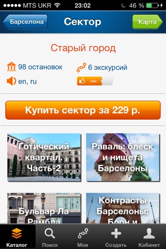 Сектор – это сочетание нескольких экскурсий, охватывающих один или сразу несколько районов города. Купить «набор» экскурсий гораздо выгоднее одиночного варианта, поскольку одна «прогулка» стоит 66 рублей, а весь сектор из шести экскурсий может обойтись 229 рублей, как в случае с Барселоной.