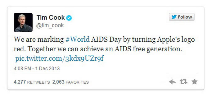 1 декабря, как известно, это не только первый день календарной зимы, но и Всемирный день борьбы со СПИДом. Компания Apple занимает в этом отношении весьма активную позицию, пропагандируя скорейшее достижение главной цели — появления поколения, рожденного без синдрома приобретенного иммунодефицита, уже в 2015 году. В поддержку инициативы Тим Кук вчера уведомил своих подписчиков в Twitter о том, что все логотипы в магазинах компании будут окрашены в красный цвет в этот день.