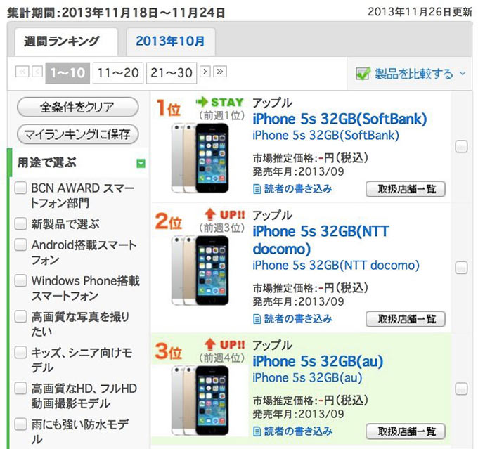 В частности, по данным BCN 32-гигабайтный iPhone 5s в текущий момент является самой продаваемой моделью у Softbank, в то время как у таких мобильных операторов как NTT DoCoMo и au/KDDI он входит в тройку лидеров.
