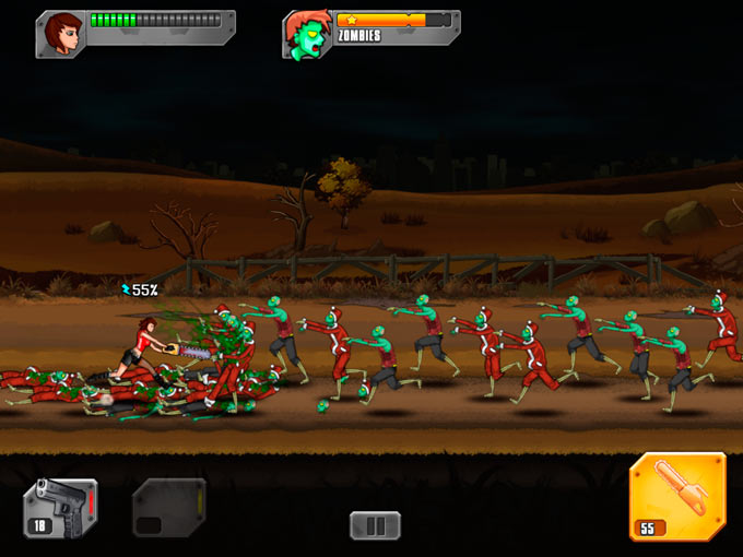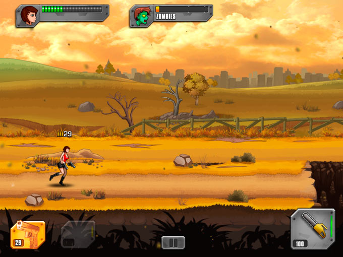 Разрабатывая мобильную игру, разработчики не стали изобретать велосипед, а взяли привычный и полюбившийся многим игровой процесс типичного аркадного раннера. В итоге нас лишили удовольствия собственноручно управлять движениями персонажа. Более того, стрелять тоже не придется, герой это делает самостоятельно, завидев на пути зомби. Все, что требуется от игрока – совершать прыжки разной сложности и выбирать оружие.