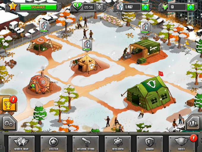 Между миссиями можно восстановить силы на собственной базе, представляющей из себя палаточный городок. Тут можно регулярно получать доход, приносимый зданиями. Также денежное вознаграждение выдается за каждую выполненную миссию. Направления, куда можно потратить заработанные средства, довольно стандартны: оружие, броня и улучшения. Однако новые виды оружия и брони открываются по мере повышения уровня основной базы, а это уже не самое дешевое удовольствие.