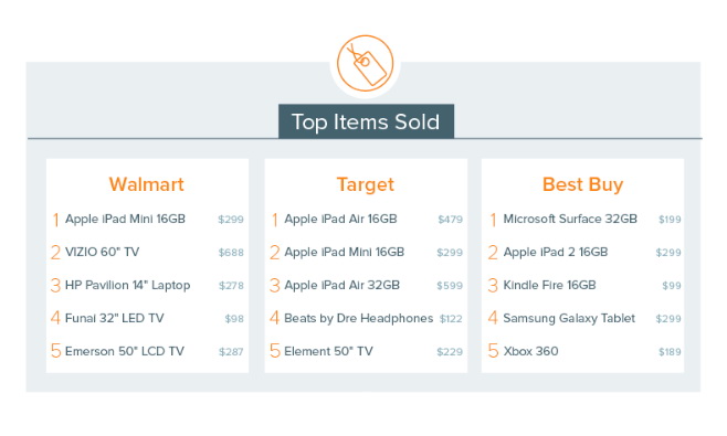 В таких популярных в Черную пятницу торговых точках как Walmart, Target и Best Buy планшеты Apple заняли 5 из 15 позиций среди наиболее востребованных товаров. К примеру, 16-гигабайтный iPad mini оказался хитом продаж в Walmart. Тогда как в Target iPad Air с аналогичным накопителем стал самым востребованным продуктом, на втором месте — iPad mini с 16 ГБ и на третьем — 32-гигабайтный iPad Air.