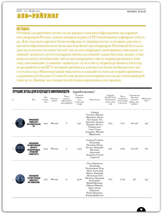 Например, в этом номере продолжает развиваться рубрика «Рейтинг», в рамках которой опубликован материал «Где учат на олигарха». Наличие высшего образования, конечно, не 100-процентный залог успеха и есть немало примеров, когда прекративший грызть гранит науки студент начинал заниматься бизнесом и преуспевал буквально в мировых масштабах. Среди самых ярких примеров стоит упомянуть основателя Microsoft Билла Гейтса и одного из основателей Apple Стива Джобса. Но это гении и исключения или, скорее, исключительные гении. В большинстве случаев успешные бизнесмены имеют мощную базу знаний, заложенную в высших учебных заведениях.