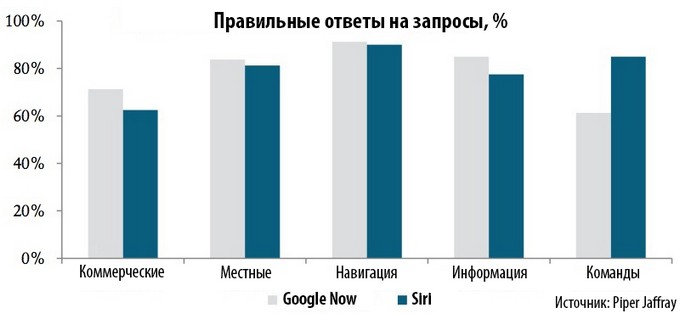 Результаты оказываются довольно-таки удручающими. Год назад Siri существенно опережала детище Google по всем возможным параметрам, начиная от частоты и точности распознавания до качества отображаемых ответов. Теперь же Google Now не только сравнялся, но и местами опередил Siri, особенно по информативности и качеству представляемых данных. К сожалению, графики и данные Piper Jaffray не учитывают местных сервисов – например, Яндекс, обрабатывающий часть запросов от Siri в России. А жаль. [macrumors]