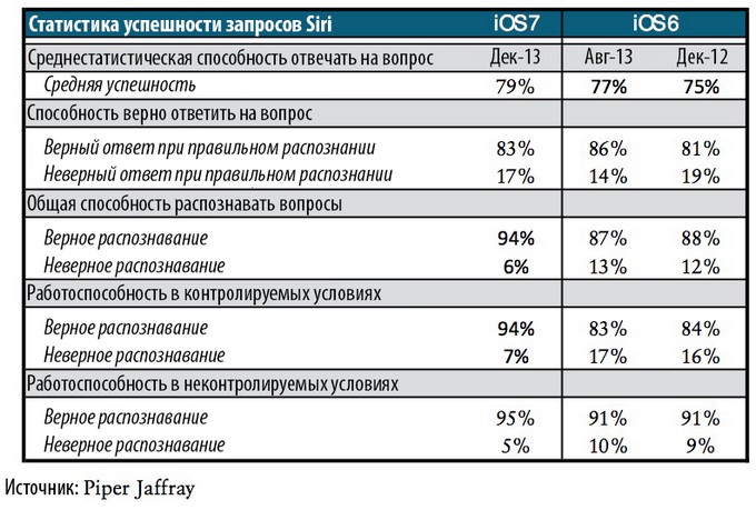Apple уделила немало внимания новым возможностям сервиса Siri на презентации iOS 7. Помимо возросшей функциональности, со сцены звучали убеждения про улучшенную частоту распознавания речи. Отзывы пользователей в итоге не были такими же категоричными: кто-то, наоборот, отметил ухудшение результатов. Горячо любимый в Apple аналитик Джин Манстер провёл собственное исследование: вывел и сравнил статистику удачных распознаваний команд сервисом Siri на iOS 6 и на iOS 7. Действительно, не всё так радужно – но на немного другом фронте.