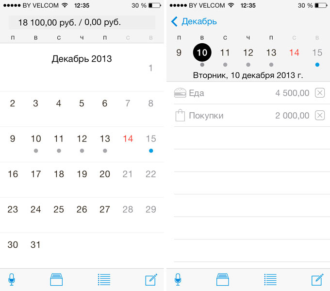 Первое, что обращает на себя внимание после запуска приложения «Деньги Говорят» – это необычная его структура. Мы видим практически стандартный календарь iOS, который, однако, содержит не встречи и дни рождения, а ваши доходы и расходы. Вверху отображаются общие расходы за месяц, а также предполагаемый бюджет, который можно задать вручную.