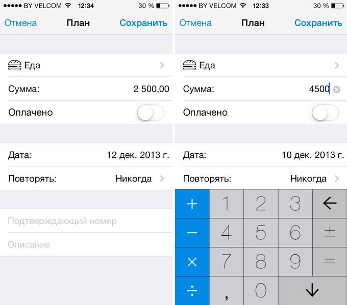 Определившись с категорией, необходимо ввести сумму платежа. Важно сразу же отметить, была ли совершена оплата. Если нет, то можно указать дату, чтобы приложение заранее напомнило совершить платеж. При необходимости можно ввести примечание, содержащее детальное описание платежа.