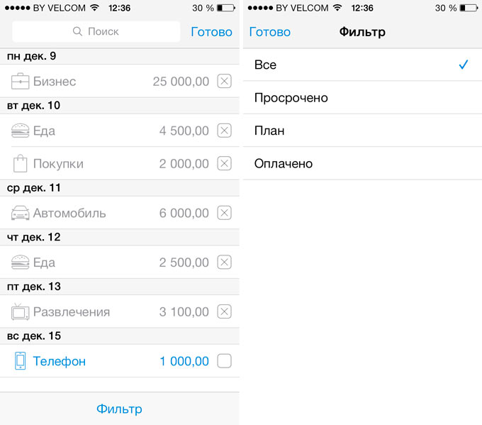 Все операции делятся на состоявшиеся и будущие. Первые отмечены в календаре серым цветом, а вторые синим и красным, чтобы не забыть, например, оплатить телефон. Альтернативой календарю служит более традиционный список, который хоть и разделен по дням, но предлагает взглянуть на все операции сразу, не выделяя каждый отдельный день. Здесь также можно настроить фильтр, чтобы найти отдельные записи.