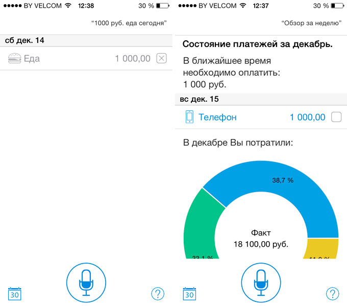 Пока Apple усиленно развивает Siri, разработчики приложений изобретают собственные варианты использования голосового ассистента. Например, приложение «Деньги Говорят» представляет собой весьма оригинальный способ управления личными финансами. Не секрет, что многие люди предпочитают хранить свои приходно-расходные операции не в памяти, а на бумаге или, например, в специальном приложении. «Деньги Говорят» от iBear предлагает не отвлекаться на ручной ввод каждого платежа в интерфейс приложения, а использовать для этих целей собственный голос. Получилось очень удобно и, главное, функционально.