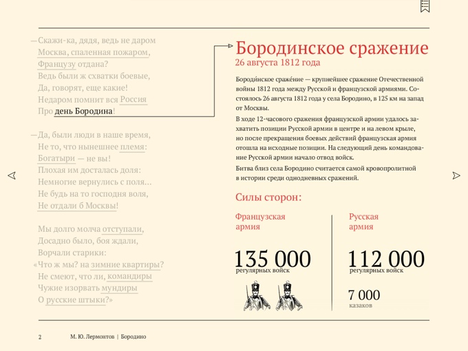 Когда, в какой численности и с между кем прошло Бородинское сражение. Что такое «русские штыки», что такое «лафет», о каком полковнике идёт речь в стихе и даже в какой хронологической последовательности и как горела Москва, сданная при отступлении французам. Всё это описывается читателю с одного касания.