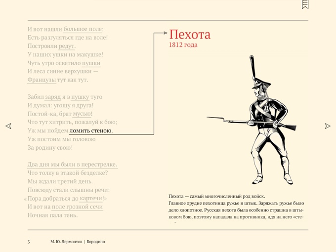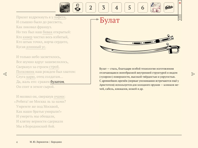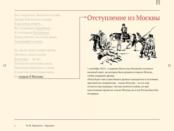 Последнее я помню наизусть до сих пор, хотя прошло немало лет. Я также помню, как помогала выучить это стихотворение своей подруге, младшей меня на год, по-актёрски руками «проговаривая» каждую строчку. Но времена проходят и дети уже редко когда делают уроки вместе, зато в App Store не так давно появилось такое удачное приложение, как «Бородино» От DeCafe, помогающие глубже вникнуть в произведение и понять каждое написанное слово.