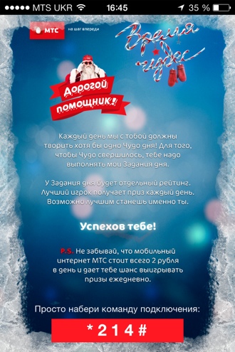 Мороз Иванович не без причины всё время подсказывает вам, что для постоянного коннекта лучше всего подойдёт мобильный интернет от МТС за 2 рубля в день, ведь он переживает за то, чтобы вы оставались всегда в Сети. Но это так, лирическое отступление от основной цели приложения.