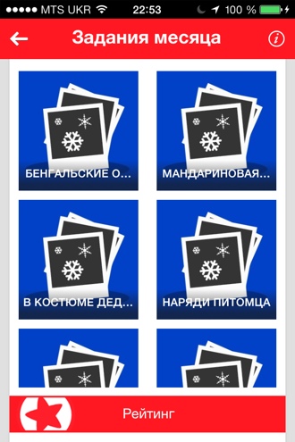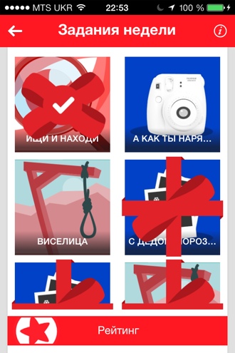 Приложение предлагает участвовать в трёх категориях конкурсов: задание дня, задание недели и задание месяца.