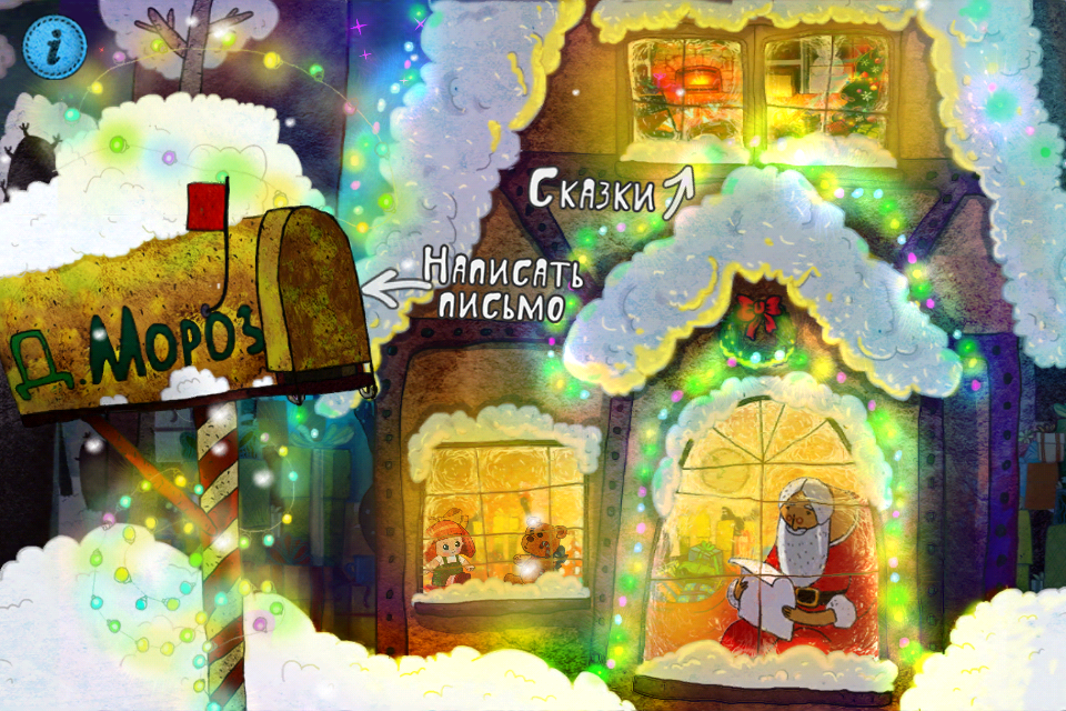 Приложение доступно на трёх языках (русском, украинском и английском) и в двух плоскостях: «послушай сказку» и «напиши письмо». Первое хранится за заснеженным окошком домика Деда Мороза в далёкой и холодной стране, и выбирая его, мы готовы послушать одну из пяти сказок о лесных животных и о Новом годе.