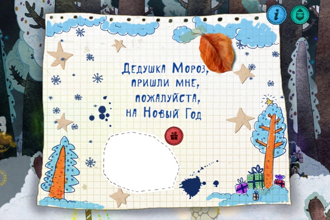 Чтобы вернуться в главное меню, для первоначального выбора между сказкой и письмом, нужно тапнуть на зеленоватую мордашку Деда Мороза в левом верхнем углу экрана. Вы переместитесь вновь на опушку леса к заснеженной избушке новогоднего сказочника и к заветному ящику с письмами.