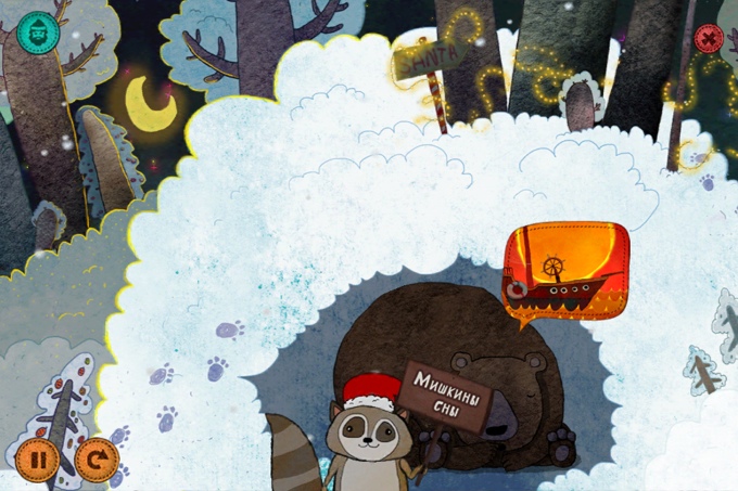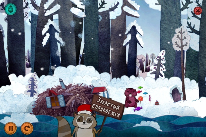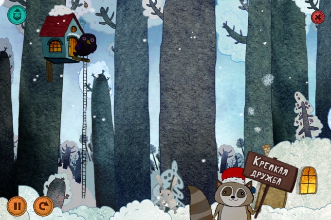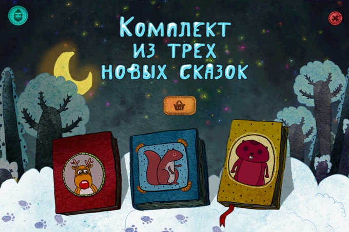 Каждая из пяти сказок – это отдельно прорисованный и озвученный мультфильм, где закадровый голос очень душевно повествует о сонном мишутке, храбром зайчишке, смешном лосе или прозорливой белочке. Поучительную сказку можно в любой момент остановить (маленькая кнопочка «пауза» в левом нижнем углу экрана) или начать заново (круговая стрелочка рядом). Чтобы закрыть сказку совсем нужно тапнуть на небольшой крестик в правом верхнем углу.