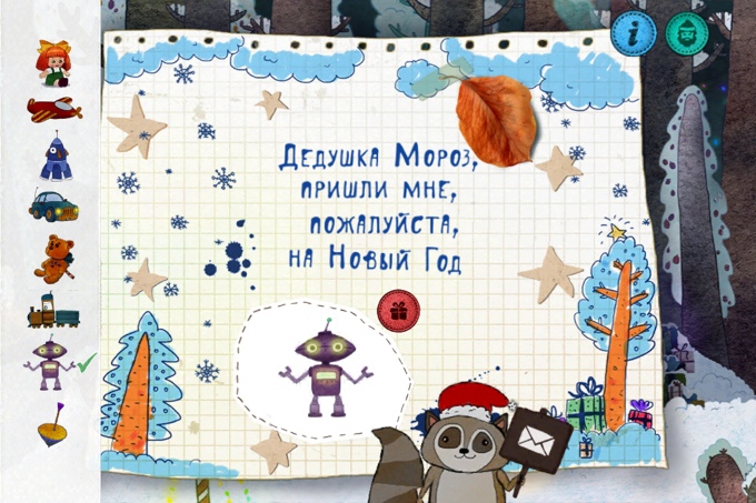 «Написать письмо» – это небольшая детская игра, помогающая нафантазировать виртуальный подарок и тут же получить его от Деда Мороза. Кукла, робот, машинка, медвежонок или самолётик прилетят вам в подарочной коробке прямо к ёлке. Коробочку нужно немедленно открыть и «поиграть» немного с игрушкой, после чего она переместится на полку шкафчика, где и будет сидеть, пока вы её в очередной раз не выберете поиграть.