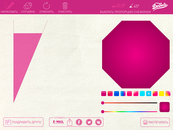 Приложение «Вырежи снежинку» является образцом минимализма. В версии для iPad приложение ограничивается всего одним экраном, с которого выполняются все возможные действия. Версия для iPhone выглядит несколько иначе лишь по той простой причине, что на небольшом экране смартфона не удалось уместить все инструменты. Итак, приступим к творчеству. На выбор доступны два варианта складывания бумаги: маленький, составляющий всего 22,5 градуса, и более солидный, угол которого равняется 45 градусам. Определившись с главной, пожалуй, дилеммой в приложении, можно начинать создавать собственный шедевр, не расходуя при этом бумагу.