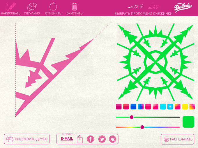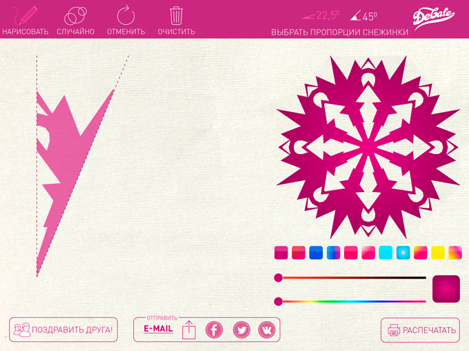 В левой части экрана расположена рабочая область, где простыми жестами можно делать надрезы на бумаге или вырезать целые области. Любое ваше действие мгновенно отражается справа на примере уже развернутой снежинки. Сверху присутствуют инструменты, позволяющие отменить последнее действие или начать процесс с самого начала. Кроме того, в правой части экрана можно мгновенно изменять цвет будущей снежинки. Выбор настроек для данного действия достаточно велик.
