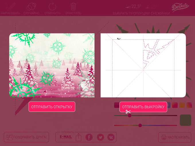 Полученный результат можно отправить друзьям в социальных сетях, по электронной почте или распечатать на принтере. Какой бы вариант вы не выбрали, экспортировать можно как красивую открытку, заполненную вашими снежинками, так и схему, из которой впоследствии можно будет вырезать тот самый шедевр с экрана мобильного устройства. Приложение «Вырежи снежинку» предельно простое, но со своей задачей справляется на все 120%. При этом оно еще и бесплатно. Можно сказать, что это отличное средство, чтобы вспомнить молодость и немного повырезать праздничных украшений своими руками.
