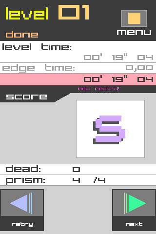 Компания Mobigame предоставляет Вам возможность побывать у меня в гостях, побыть мной, в общем окунуться с головой в кубический мир Edge. “Катайтесь” кубиком по фантастическим объемным угловатым уровням, нарушая некоторые законы физики, забираясь на стены и залезая на движущиеся предметы. Очень приятное, и в то же время весьма необычное звуковое сопровождение из шестнадцати уникальных композиций даст Вам потерять чувство реальности и зависнуть в игре не на один час. Вас ждет 48 головокружительных уровней, в каждом из которых Вам придется изрядно поломать голову.