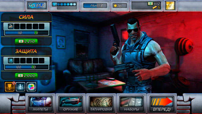 Сменяются лишь декорации и противники, которые становятся сильнее. Чтобы успешно им противостоять необходимо тратить заработанные на предыдущих уровнях деньги. Можно улучшать характеристики персонажа, делать ему татуировки, дающие особые навыки, приобретать оружие и броню, а также покупать бонусы перед каждым уровнем. В оружии строго ограничен как запас патронов, так и запас магазинов с этими патронами. Ситуацию можно исправить улучшением оружия, а также навешиванием на него различных улучшений. На все это требуются деньги, поэтому для их заработка не зазорно пройти старые уровни заново или испытать свои силы в режиме свободной игры.
