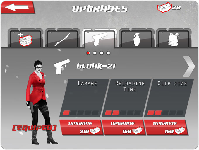 За каждую миссию мы зарабатываем виртуальную валюту, которую можно и нужно тратить на улучшения для холодного и огнестрельного оружия, гранаты, а также броню для подзащитного. Причем большинство предметов экипировки имеют несколько характеристик. Например, для пистолета это урон, время перезарядки и объем магазина. Прошли миссию, сделали пару улучшений и снова в бой, предварительно выбрав дальнейшее направление движения на карте уровней.