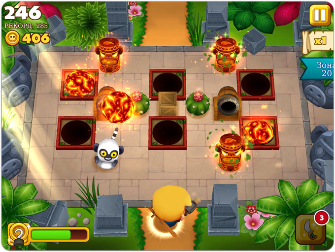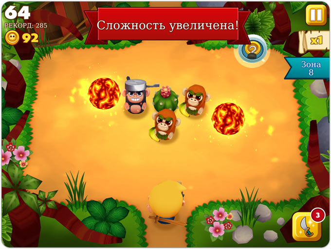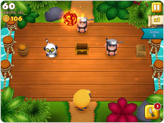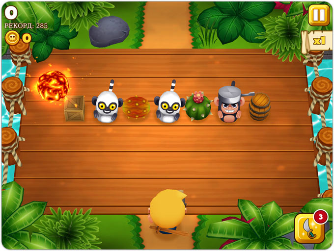 Чем дальше мы углубляемся в дужнгли, тем сложнее становится играть. Дело в том, что локации заполняются дополнительными объектами, призванными сбить нас с толку. Это сундуки с монетами, кактусы, бочки и ящики. Некоторые из них могут содержать необходимое нам золото, а другие вместо этого залепят экран красками, чтобы помешать нам истреблять обезьян. Кстати, видов хвостатых неприятелей в игре очень много и далеко не всех можно сразить с первого же касания.