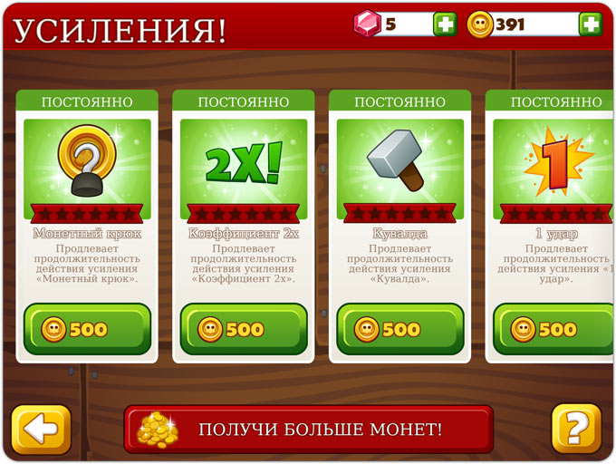 Облегчить задачу призваны многочисленные улучшения, которые делятся на одноразовые и постоянные. Однако реальная их полезность более чем сомнительна, хотя стоят они совсем не мало. Кроме улучшений можно потратить накопленное золото на новый меч, который несет в себе определенный бонус, а также открыть новых игровых персонажей.