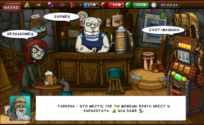 На первых минутах игры мне показалось, что это оживший Годвиль, буквально взорвавший Сеть несколько лет назад. Те же «пыльные мешки неуважения» и «невезучие резаки робости». Но здесь, кроме ржачных названий и мегасмешных персонажей, есть много дополнительных козырей, дающих фору всем существующим прототипам.