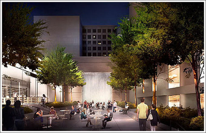 Изменения в проект вносились не единожды с момента его публикации в начале 2013 года. Напомню, что во дворике за магазином Apple собирается оформить открытую площадку со столиками и водяной стеной. Здесь же будет расположен и известный фонтан «Сан-Франциско», созданный скульптором Рут Асавой в 1973 году. Это композиция из 41 бронзовой пластины с изображением сюжетов из истории города. [ai]