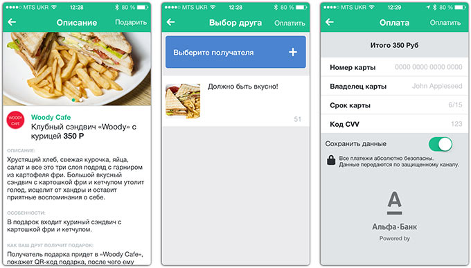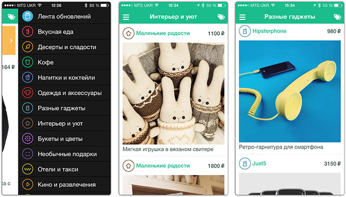 Естественно, присутствует и удобное меню выбора подарка по типу продукта, будь то одежда, гаджеты, цветы, вкусная еда, кофе, развлекательные мероприятия и т. п. Также хочу отметить приятный интерфейс со сдвижными панелями, выполненный в стиле iOS 7.