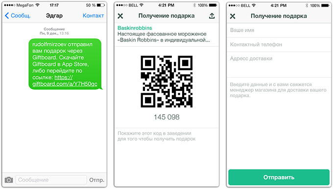 Важен тот факт, что для отправки подарка вам необходимо знать лишь номер телефона одариваемого или его Gift ID (идентификатор внутри сервиса). Причем, если приложение не установлено у получателя, ему придет SMS со ссылкой на сайт. При переходе по ссылке на экране появится информация о том, кто подарил, описание подарка и условия получения.