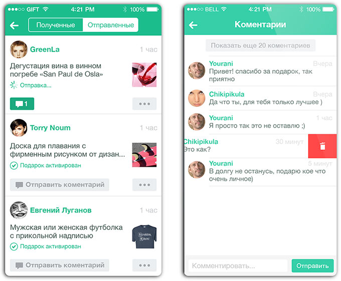 Вместе с подарком есть возможность послать сообщение (70 символов), а когда он отправлен, то сохраняется в личной истории, где можно просмотреть статус презента: «Отправлен», «Подарок открыт» или «Подарок активирован». Хотите поделиться впечатлениями о подарке? Без проблем, воспользуйтесь системой комментариев. В свою очередь, получив подарок, пользователь может поделиться фотографией презента в Facebook, Instagram или Twitter.