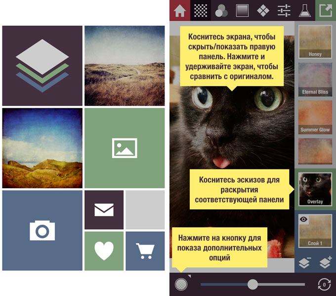 В отличие от того же PopAGraph, Stackables не предлагает пройтись по всем пунктам редактора, а предоставляет пользователю самому путешествовать по меню и возможностям приложения. Тем не менее, каждый раздел предлагает собственный набор заготовок, которые можно применять на снимок. Кроме того, для каждого фильтра можно регулировать интенсивность и его непрозрачность.