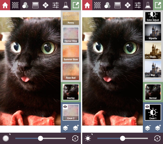 Отдельного упоминания заслуживает работа со слоями. Добавить новый слой или удалить лишний можно буквально одним нажатием. При этом для каждого слоя можно настроить свои эффекты, а их максимальное количество таково, что любой снимок можно изменить до неузнаваемости. Переключаться между редактируемыми словами, подбирая их идеальное сочетание можно в любой момент и без особых трудностей.