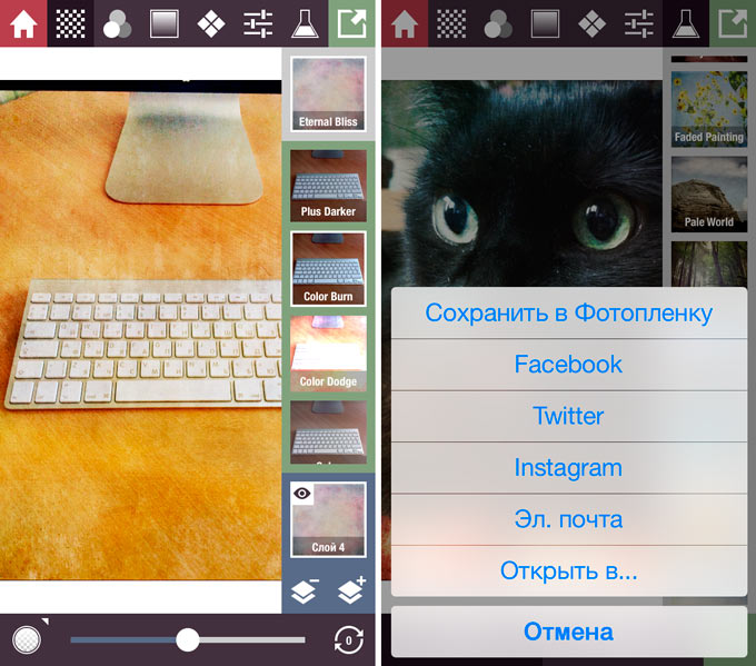 Получившийся результат можно экспортировать в социальные сети или сохранить в памяти устройства. Stackables работает быстро и также быстро переключается между слоями, не взирая на их количество и сложность. Приложение сложно назвать полноценным графическим редактором, но и банальным набором фильтров оно не является. Продвинутая работа со слоями, наличие предустановленных формул, а также большой выбор доступных фильтров и эффектов делают из Stackables вполне неплохой вариант для любителей мобильной фотографии.
