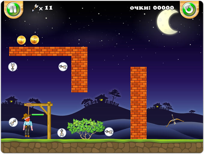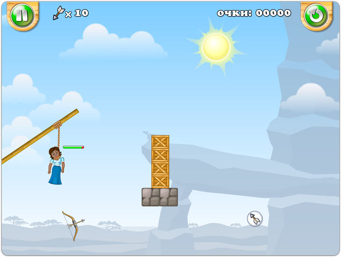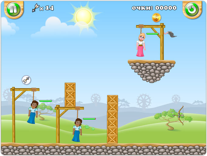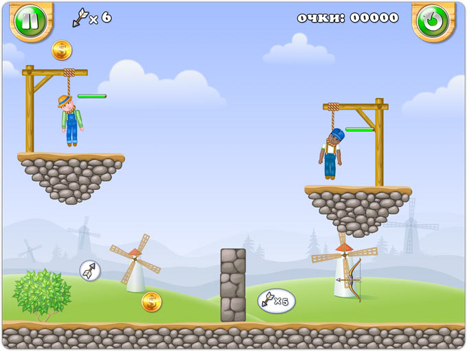 Прежде всего нужно отметить ограниченное число стрел, которое придется принимать в расчет. Также не будем забывать про регулируемую силу и направление выстрела, а также ветер, который тоже вносит свои коррективы. Кроме очевидного, игроку также предстоит столкнуться с многочисленными препятствиями. Те же ящики будут здорово мешать полету стрелы. Напоследок нельзя не упомянуть ограниченное здоровье висельников, которых мы будем спасать. Висеть вечно и ждать помощи они просто не готовы.