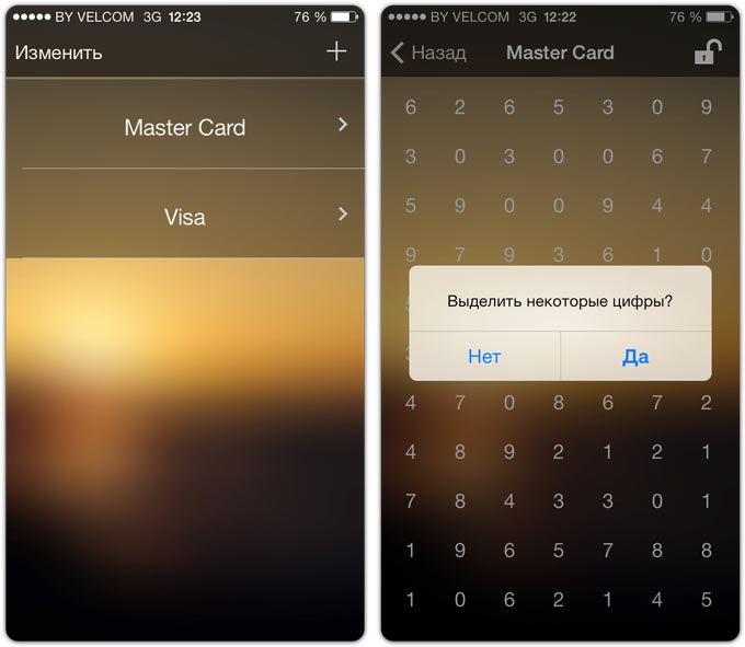 Суть же такова, что на поле размером 7 х 11 размещены случайные цифры от нуля до девяти. Они не имеют какого-либо значения для постороннего человека, но в нашей власти заменить некоторые из них так, чтобы среди них оказался спрятан пин-код. После этого можно расставить выделение, которое позволит упростить процесс запоминания места, где находится пароль. Для изменения любой цифры из матрицы необходимо задержать на ней палец, а просто касание добавляет или снимает выделение. Тапнув по иконке замка в верхнем правом углу, можно запретить измение данных в таблице, но замок снимается так же легко, как и активируется – защиты паролем не предусмотрено.