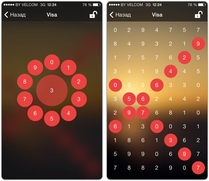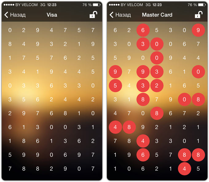 Итак, сперва необходимо создать новую цифровую таблицу, введя для нее название. Это может быть имя кредитной карты или банка, который ее выпустил. А можно и не вкладывать какой-либо смысл в название, чтобы еще больше усложнить задачу тем, кто попытается получить доступ к вашей информации. Создав таблицу, нужно ответить всего на один вопрос: выделять ли некоторые цифры случайным образом. Если ответить утвердительно, то на цифровом поле некоторые значения будут подсвечены красным – это своего рода подсказки для памяти пользователя, который может расположить их наиболее удобным для себя образом.