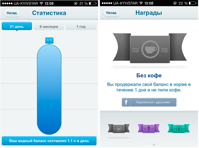 Waterbalance имеет и собственную систему поощрения. Так, прочитав все предложенные советы «О воде» (в приложении их всего 11), служащие значительным стимулом, вы получаете статус «Эксперта». Кроме того, предусмотрены и специальные награды за соблюдение баланса в течении 1,3,7,21 дней, а также награда за «Отказ от кофе». Каждым достижением вы можете поделиться в социальной сети.