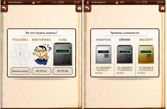 Игры. Несмотря на то, что «Марки» являются игрой, разработчики предусмотрели возможность отвлечься с пользой. Поиграв в «Угадайку», «Викторину» или «Сейф» у вас появляется шанс выиграть несколько монет и одну дополнительную марку. Чем выше уровень сложности выбранной игры, тем более щедрый трофей в случае выигрыша вы получите!