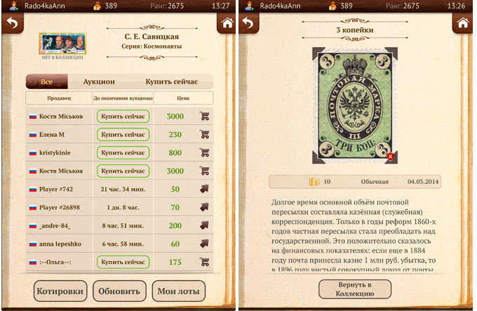 Аукцион. Приготовьтесь, вы попали на самый настоящий аукцион с ожесточенными торгами, небывалым ассортиментом самых редких коллекционных образцов марок и самым широкими диапазоном цен. Все лоты делятся на несколько категорий: «Золотые», «Серебряные», «Обычные» и «Редкие». Разумеется, что все их отличают цена и количество доступных лотов, выставленных на продажу другими пользователями. В этом же пункте меню есть возможность добавить с свой собственный лот, указав время аукциона и цену. Одним словом, все, как в реальности, но не забывайте, что это игра.