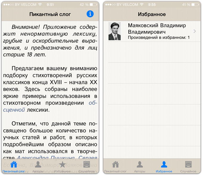 О далеко не самом цензурном содержимом приложения предупреждается еще в App Store. Затем аналогичное уведомление демонстрируется при запуске программы, но там же объясняется и практический смысл подобной программы. Дело в том, что стихи, содержащиеся в «Пикантном слоге», действительно могут не встретиться в обыкновенном сборнике, скажем, Пушкина или Некрасова. А здесь они есть и, более того, приложение служит своего рода подборкой подобных произведений.
