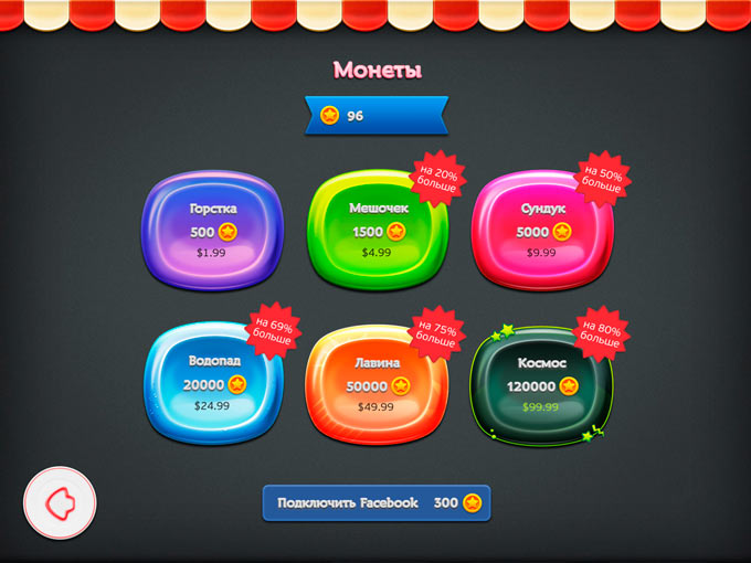 Если количества заработанных монет окажется недостаточным, вы можете приобрести дополнительную сумму игровых монет за реальные деньги.