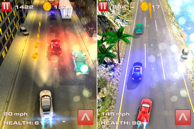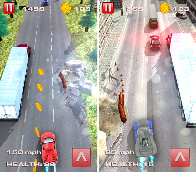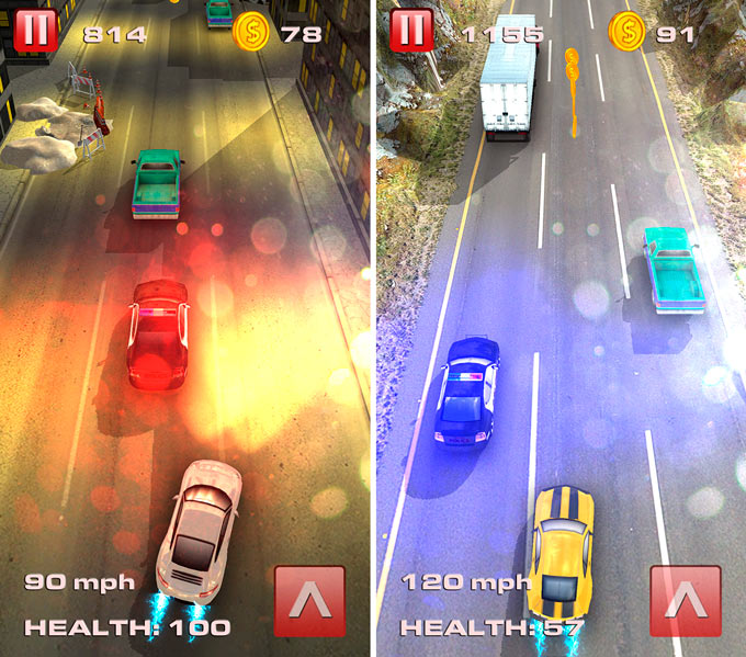 На самом деле какой-то предыстории в игре нет. Выбираем трассу, автомобиль и вперед! Тормозить действительно нельзя, зато поддать ускорения при помощи нитро можно в любой момент. Лавировать в потоке придется посредством гироскопа и наклонов устройства влево или вправо. Любая дорога в игре трехполосная и все участники движения едут в одном направлении, поэтому аварий лоб в лоб в игре нет.