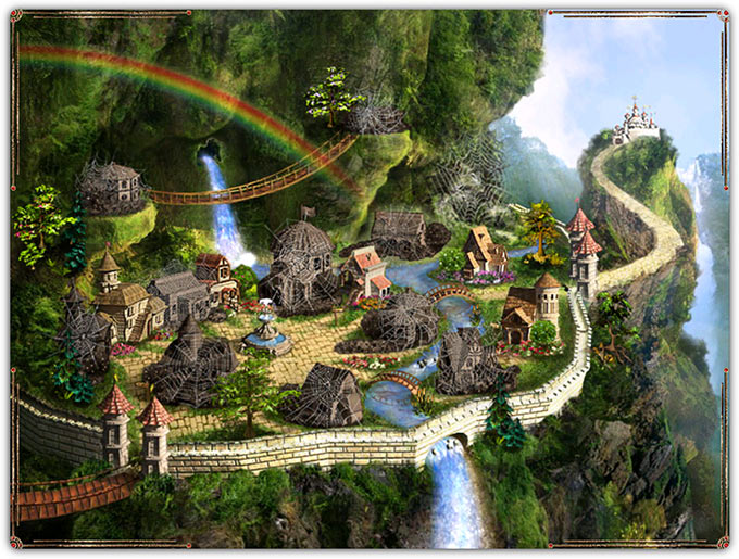 Завязка игры, как в заправском экшене: вы возвращаетесь в Радужное Королевство и обнаруживаете, что весь город покрыт паутиной, дома пустые и кажутся заброшенными. Оказывается, тут поработал паук-Колдун, которого придется наказать.