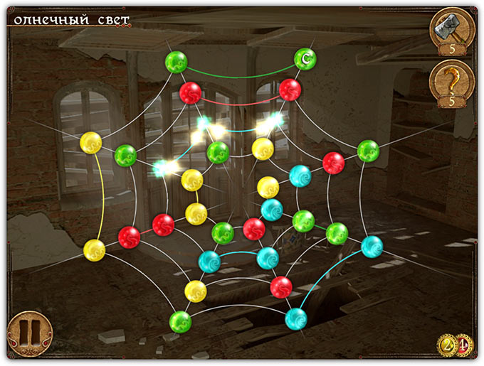 Все дома в паутине, но не беда. На ее нитях осели волшебные шарики разных цветов. Собирай по три и более в ряд и будешь получать магическую энергию для восстановления королевства. Можно сказать, что мы имеем классическую фэнтезийную завязку и не менее классический геймплей, но в данном случае процесс распыления цветных шариков не совсем стандартный. Как я упоминал выше — все они расположены на паутине и фактически связаны ей друг с другом. То есть перемещать можно в строго определенных границах, причем шарики уничтожаются как в горизонтальной оси, так и в вертикальной: