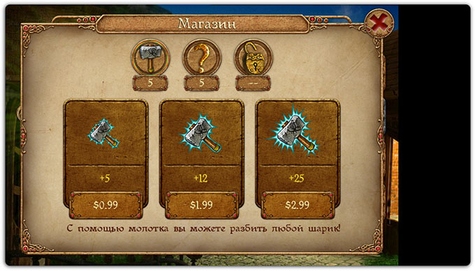 Стоит отметить, что особая «паутинная» геометрия игрового поля по первой была очень непривычна и вызывала у меня ступор даже на первых этапах. Не то чтобы это плохо, наоборот — мозги становятся набекрень, что прикольно и дает новые ощущения от геймплея. Но на привыкание у меня ушло около часа, в процессе которых я умудрился растратить все изначально доступные инструменты помощи, а именно — молот, с помощью которого можно разбить любой шарик, и подсказки. При желании их можно купить в местном магазине, но…