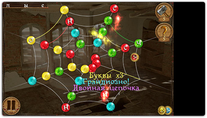 Обратите внимание на буквы, расположенные на некоторых шариках. Собственно, это ваша основная цель. Как только поле очищается от сфер с буквами, вы складываете волшебное слово и переходите к следующему уровню. Кстати, буквы — это еще и обучающий элемент для детей. Например, мои сыновья очень любят наблюдать, как я играю, и младший с удовольствием называл «спасенные папой буквочки».
